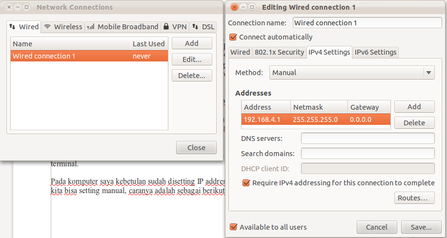 wired baru. Lalu pada tab IPv4 setting buat IP addressnya sesuai dengan